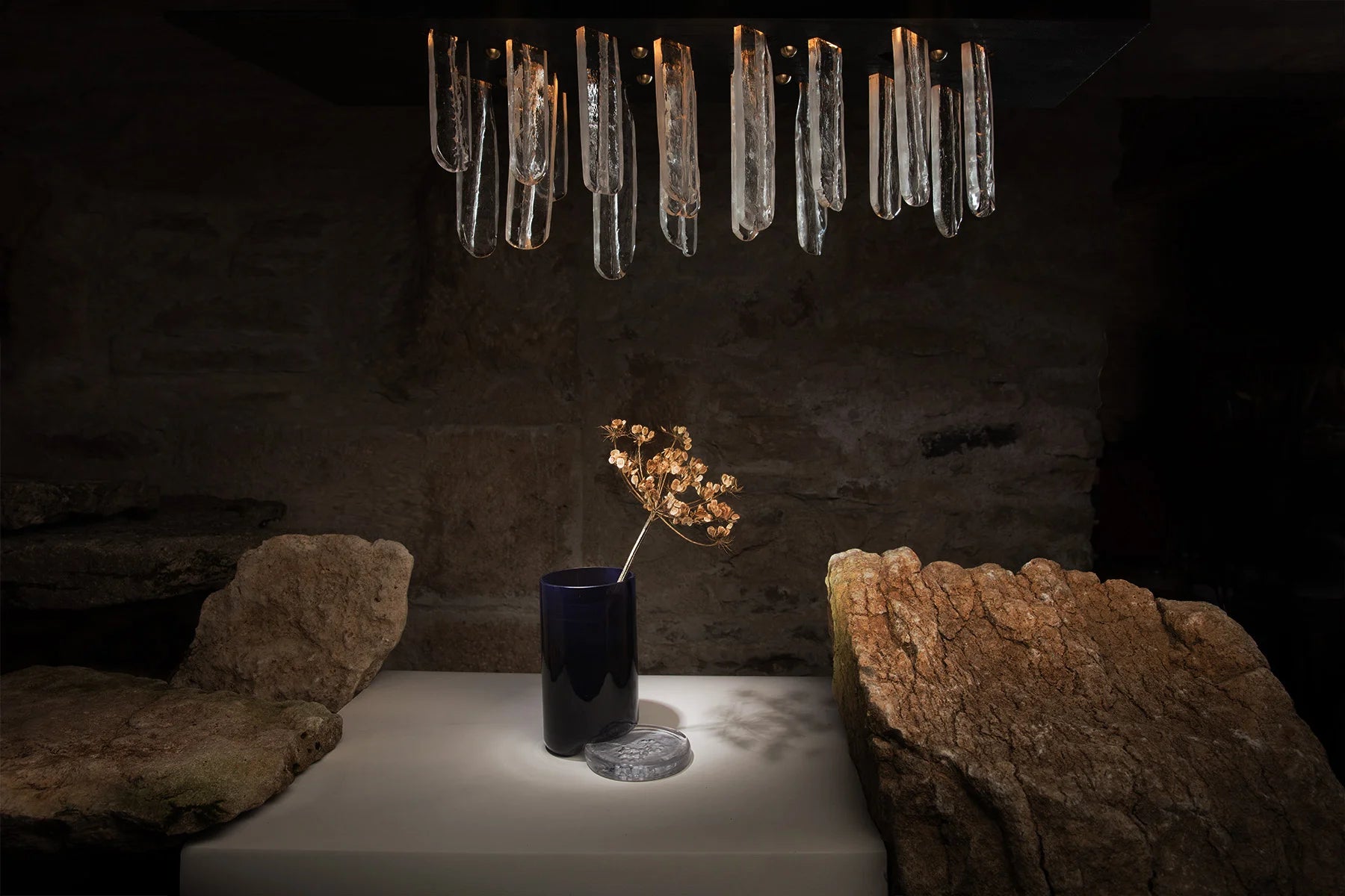 In 2022, Cime was born. Cradled by planetary upheavals, this Collection encapsulates traces of the surrounding environment. From gathered dry twigs, frozen by fire, emerge solid glass forms.